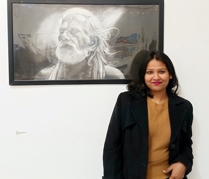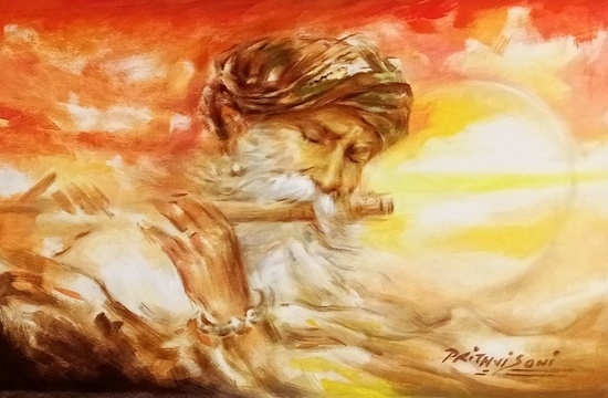 Sikandar Jangra drew the audience's attention to the paintings of Prithvi Soni, an outstanding artist from Mumbai and one of Bollywood's most famous and respected artists and designers. His work often features scenes from rural life; he is famous for his delicate and graceful portraits of women against romantic landscapes, as well as his depictions of seasoned musicians. A portrait of a girl and an image of an inspired old man playing the flute were featured in the exhibition.