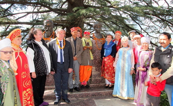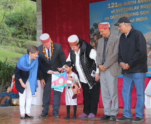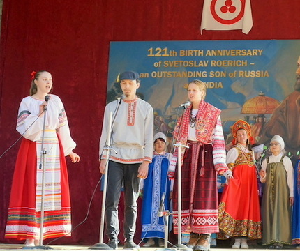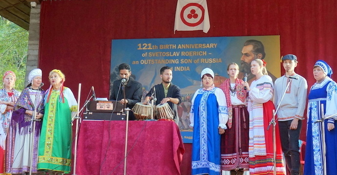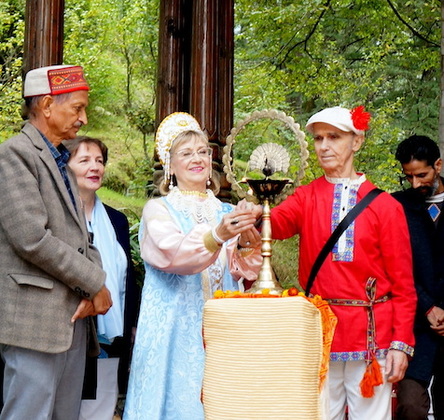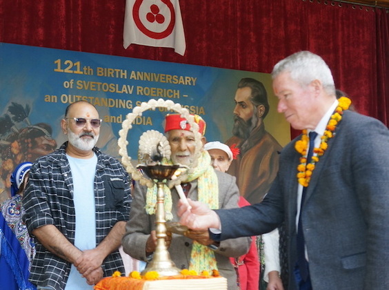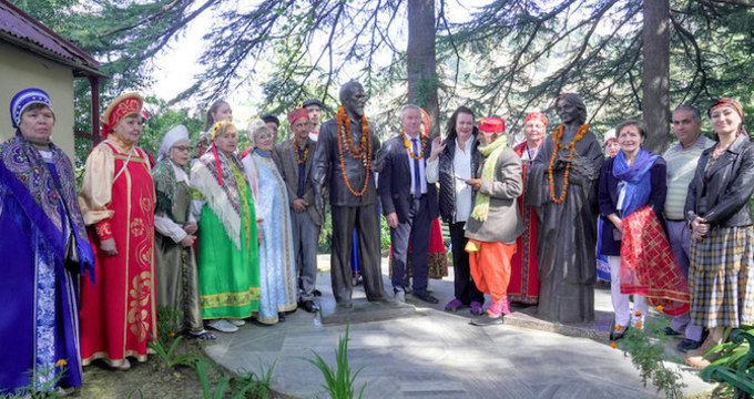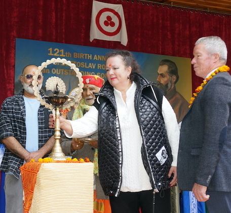 Following the ceremony, guests and organisers led by the pujari made a procession and laid garlands of marigolds on the sculptures of Svetoslav Roerich and his wife Devika Rani, as well as on the bronze busts of his parents, Nicholas and Helena Roerich.