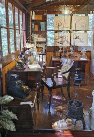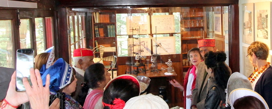 IRMT Russian curator Larisa Surgina, representing the International Centre of the Roerichs (Moscow), informed the assembled guests that this was the third inauguration of the Urusvati Chemical Laboratory. She was pleased to announce that laboratory tables and memorial shelves have been partially restored, especially for the new exhibition. Their shelves contain books from the Urusvati library and archive folders that once contained letters and documents belonging to the Roerichs and their colleagues. On the table in front of the window is a memorial laboratory setup for extracting active substances from medicinal Himalayan plants; next to it is an antique laboratory heating cabinet with additional equipment. The shelves are lined with ceramic crucibles and glass flasks of various shapes and sizes, which the Roerichs and their colleagues used for various studies. Next to the table is a slide projector, which in the old days was powered by a kerosene burner. In the foreground is a ceramic water filter and a special press for squeezing. An old chair is slightly moved away from a small desk with a microscope and an open book, and it appears that George Roerich (or his younger brother Svetoslav) has just left the laboratory, leaving his work gloves on the table.