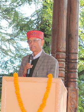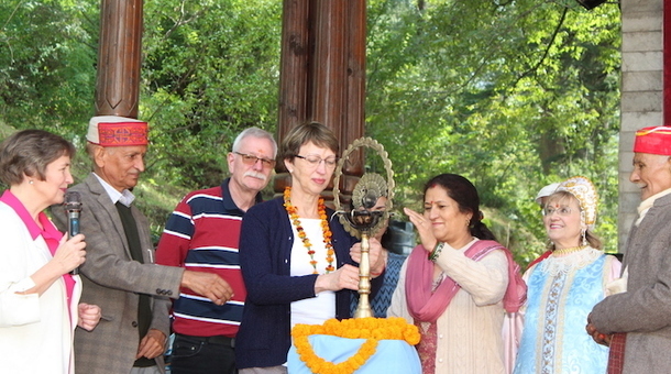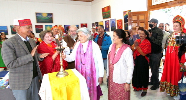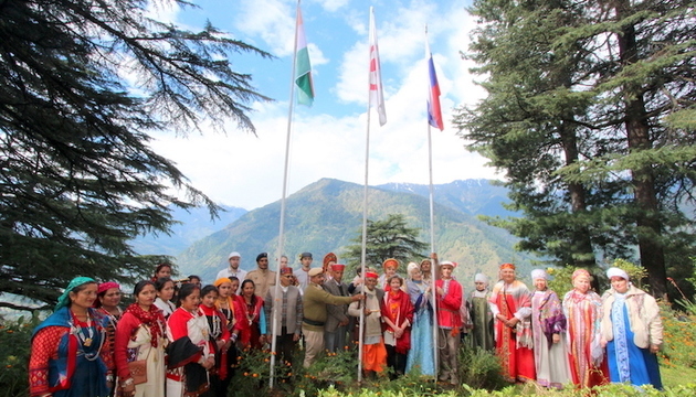 Representatives from the Indian and Russian public participated in this year's solemn ceremony of raising the national flags of India and Russia, as well as the Banner of Peace. Vishwanath Nair, a renowned master weaver, was given the honour of raising the Indian flag, alongside a group of women from the 'Colours of the Himalayas' collective whom he teaches weaving in Summa village, Kullu. Tamara Merges and Vasily Tkachev, leaders of a group of volunteers from the International Centre of the Roerichs in Moscow, raised the Russian flag together with all members of the volunteer team. As is tradition, the Banner of Peace was raised by the Indian and Russian curators of the IRMT, together with Galina and Rainer Schneider, the President and Deputy President of the German Roerich Society, who were honoured guests of the Roerich Trust.