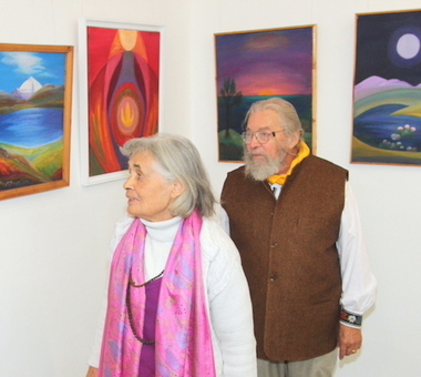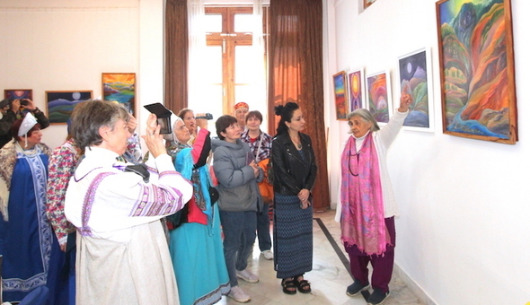Following the ceremony and festive laying of floral garlands on the bronze busts of Nicholas and Helena Roerich, all guests and participants of the Festival proceeded to the IRMT Exhibition Hall, where a painting exhibition by renowned artist Carol Mary Fraser was opened. Originally from Great Britain, Carol lived in India for over 20 years, travelled to the sacred peaks of the Himalayas and wrote books about her spiritual and creative journey. A musician by training, Carol's innate musicality and professional knowledge are embodied in the colourful tonality and smooth lines of her paintings. "The Lake of Mind. Contemplation on the Way to Shambhala", the exhibition's poetic title, reflects Carol Fraser's profound reflections on the human psyche and those sacred concepts that everyone who embarks on a moral and spiritual development journey will sooner or later approach. The symbolism of the paintings encapsulates the artist's personal spiritual experiences, which she wishes to share with viewers by inviting them on a fascinating journey into the depths of the microcosm and macrocosm.
