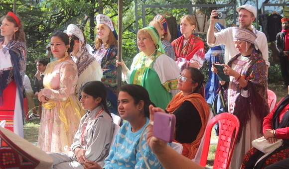 As participants and guests of the Festival opened exhibitions and got to know the new display, music played on the IRMT Green Theatre stage. Meanwhile, the students of the Helena Roerich Academy of Arts for children and their teachers were putting on their final show, while parents took their places in the audience. In front of the stage, women members of the Manav Bunae creative women's group from Naggar, masters of knitting, weaving, braiding and other decorative and applied arts, had already set up their exhibition and sale. Nearby, Russian beauties in sarafans and kokoshniks (members of the ICR volunteer group) offered everyone the opportunity to taste Russian rusks, gingerbread and sweets.