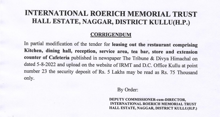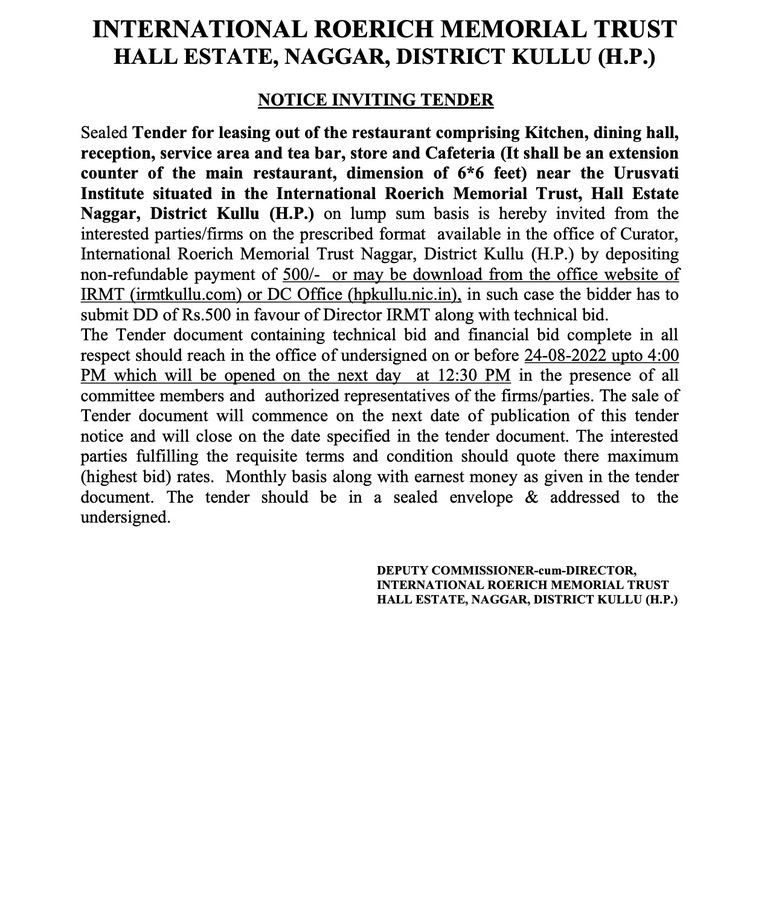Press to download the documents: «Sealed Tender for Leasing out of the IRMT Restaurant», "Corrigendum regarding tender notice for lease out of Restaurant".